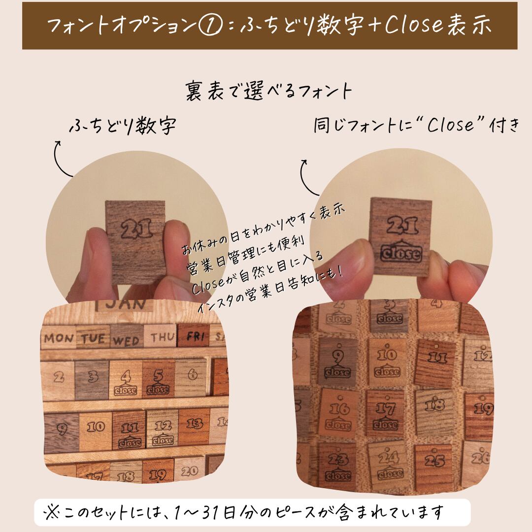 【日付ピースオプション】木製万年カレンダー用|吊り下げ式/スライド式対応|選べる4種デザイン|1〜31日セット(本体別売)|Wooden Calendar Date Piece Set|Perpetual Calendar Accessory|Hanging or Slide Type Compatible|4 Font Styles|1–31 Numbers Only(Calendar Body Sold Separately) | HAYAMA WOODWORKS STUDIO